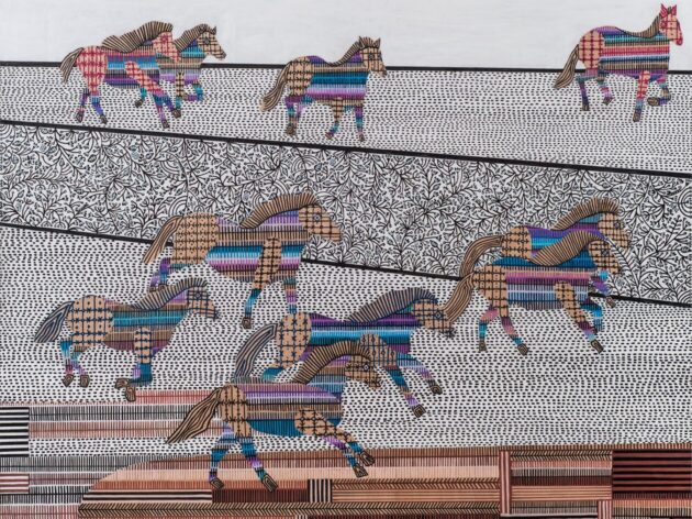 Her work often begins with loose outlines that evolve into highly detailed imagery. Using animals, repeated shapes, and vivid colors, she creates imaginative worlds that feel both playful and deeply reflective.